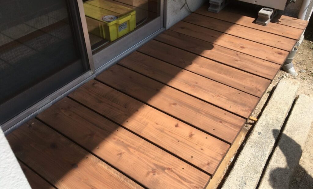 5月のゴールデンウィークに思い立って(旅行もキャンプも行けなかったし)自宅の縁側のデッキ材を貼り換えたのがいい具合だ。元々の縁側は、30×60ミリの材を縦使いで約70mmピッチで貼ってあったのだけど、それはつまり3センチの棒が隙間4センチを開けて並んでいる状態なわけで、素足では立ち歩くのも不便だし、物を落とせば隙間に落ちて拾うのも大変だったので、家に余っていた合板を敷いていた。縁側に座ってお茶でもすすっていた日にはお尻が痛くて痛くて座布団必須だ。隙間にもう1本ずつ入れてあれば良いものをと恨めしく思っていた。いっそ全部解体して使える材は使いまわしてすっかり作り直そう!と勢い込んだけど、特に傷んでいるわけでもなかったので、上から杉足場板を増し貼りする方向で落ち着いたのだった。結果、和室からの出入りの段差も縮まったし、洗濯物干し竿にも届きやすくなったし、廃棄処分する木材も出さずに済んだ。