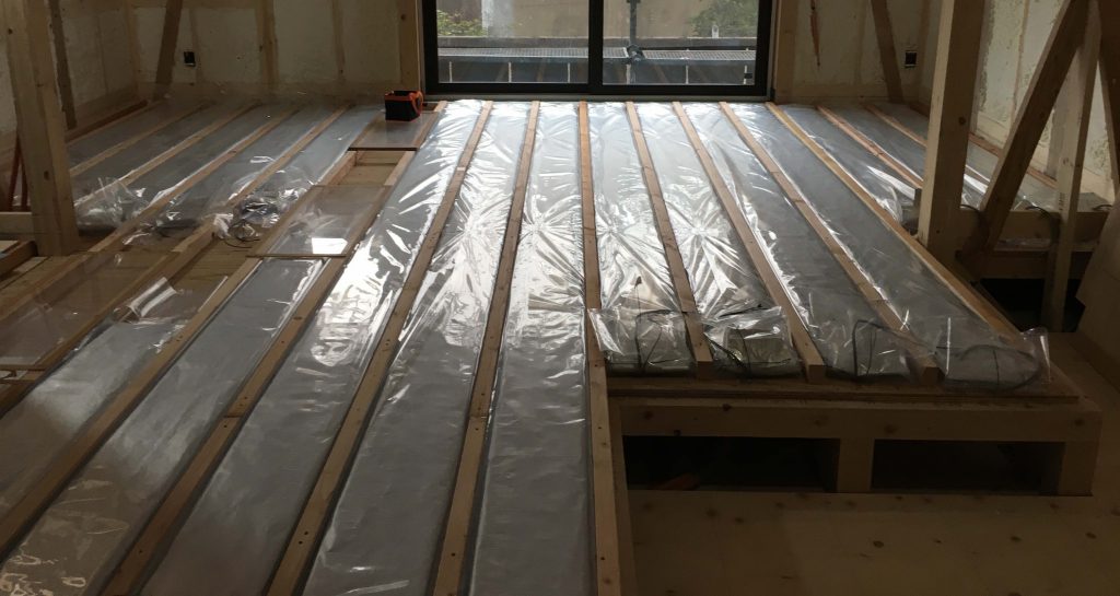 その翌日、少し時間は押してしまったけど大山崎の現場は予定どおりに完了し、夜のうちに車の荷物を積みかえて、翌朝アクアレイヤー工事@養父市に向けて出発した。養父市の工事は住宅用エアコンを熱源とするタイプのアクアレイヤー「エアアクア」である。エアアクアは水パックへの熱伝導効率を上げるため、下地に鉄板を使用するので積荷が重く運ぶのが大変だ。さて、残る設計班(←わたし一人だけど)は数日車が使えなくてちょっと不便するけど、電車移動や歩く楽しみもあるので良し。