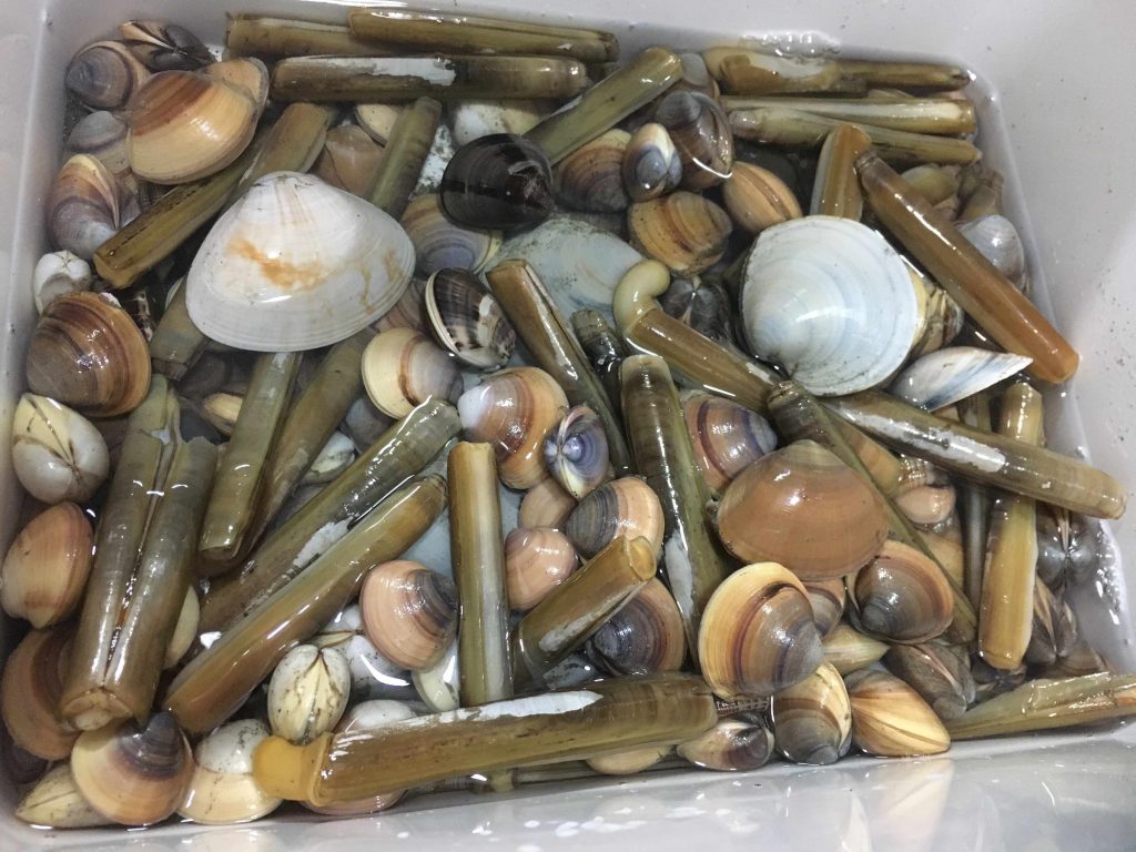 マテ貝はにんにくとバターでさっと炒めていただきました。甘みが強くて味が濃い。他には小ぶりなハマグリがいくつか。シオフキガイやらカガミガイというらしい貝(ぜんぜん見分けがつかない)をたくさん持ち帰ってきたけれど、味は良いけど砂出しができないとかでほとんどの人はリリースするそうで。炙って食べてみたけれど、確かにちょっと砂っぽくて抵抗あるかも。次男はうんめ〜って気にせず食べてたけど。