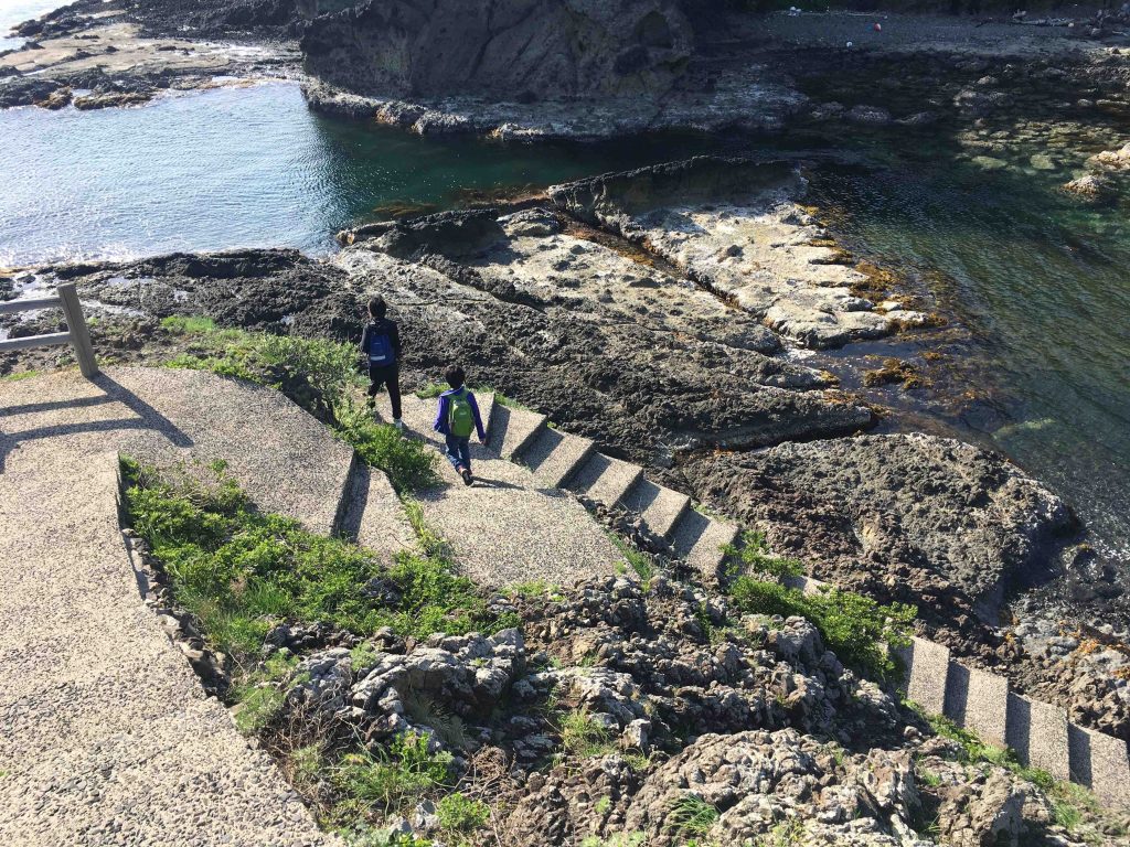 別行動中の家族は、釣りをするつもりで日本海へ向かったのだったけれど、風も波も強くて難しかったため桂島を散策したとのこと。ジオパークに指定された桂島の、溶岩でできた絶景を楽しんだようす。あとで写真を見せてもらいながら話を聞いていると、こどもたちの興奮が伝わってきた。よかったよかった。